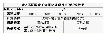由表2还可看出,当金属化处理时W的沉积温度低于900℃时,W层与金刚石的结合强度不高,W膜在焊后刃磨过程中受冲击时易与金刚石脱离,其原因可能是在低于900℃条件下沉积的W膜与金刚石间的碳化物界面过渡层厚度不够,从而影响了结合强度。