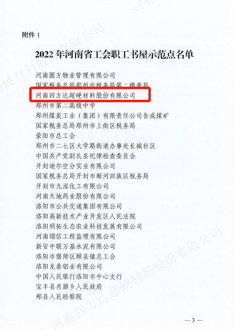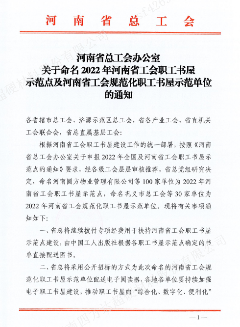 近日,河南省总工会发布《关于命名2022年河南省工会职工书屋示范点及河南省工会规范化职工书屋示范单位的通知》,河南9001cc官网职工书屋荣获2022年河南省工会职工书屋示范点。