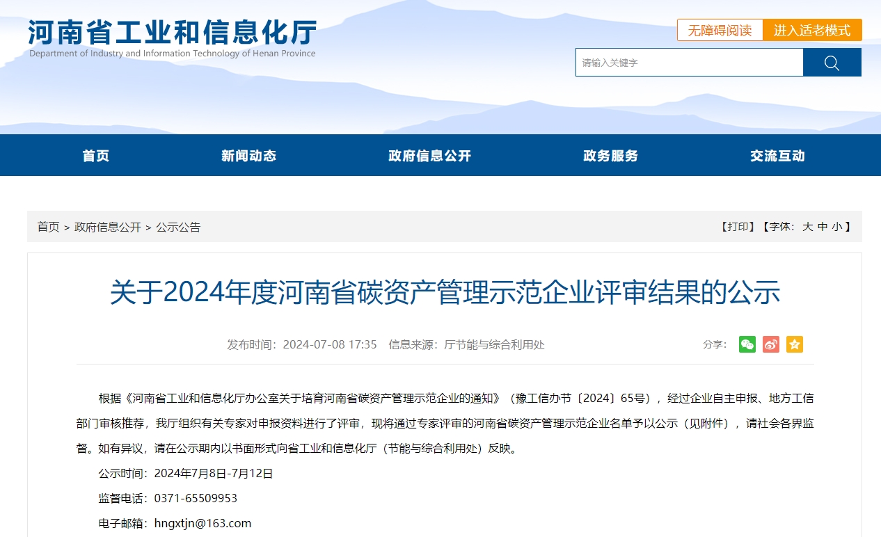 近日,河南省工业和信息化厅发布《关于2024年度河南省碳资产管理示范企业评审结果的公示》,以诚为本赢在信誉9001cc再度荣耀加冕, 被评为“河南省碳资产管理示范企业”。